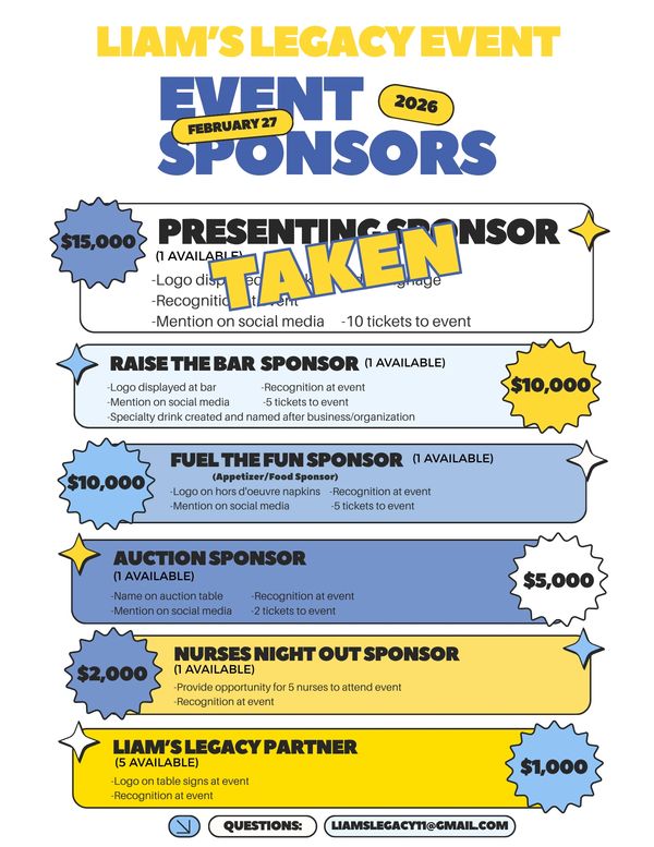 Email the team at liamslegacy11@gmail.com to request the full sponsorship packet or reserve your level. Ticket sales are coming soon, check back here!